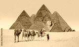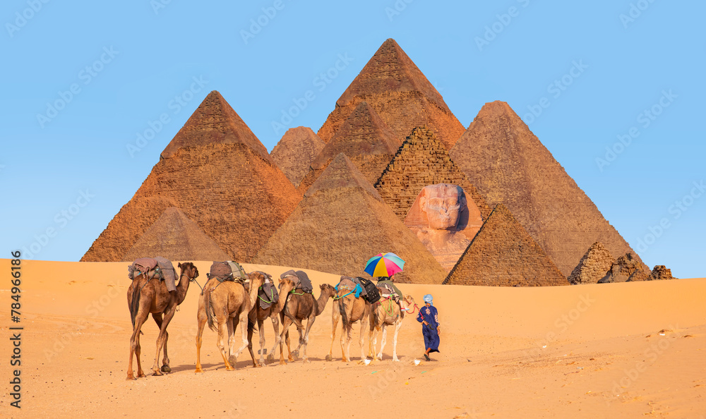 A woman tourist riding a camel with a multicolored umbrella - Abstract background many pyramid in Giza - Cairo, Egypt