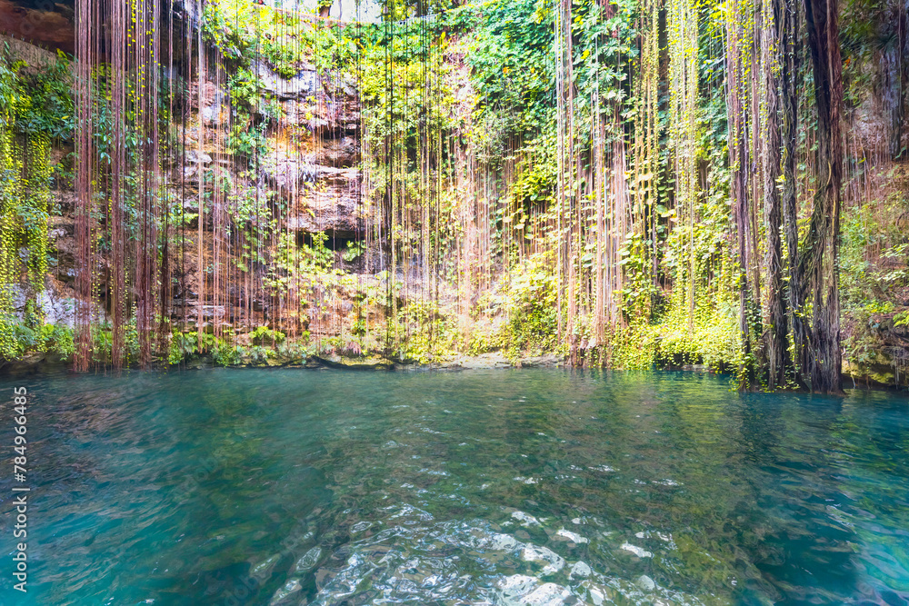 Ik-Kil Cenote near Chichen Itza, Mexico. Lovely cenote with transparent turquoise waters and hanging roots - Yucatan Peninsula, Mexico