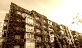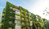Green building with plants growing on the facade. Ecology and green living in city. Eco-building covered with ivy (green wall or bio-wall). Ecological vertical forest.