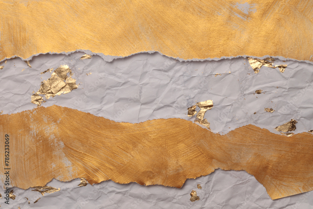 Gold, bronze crumble torn paper painting wall. Abstract glow texture copy space relief background.