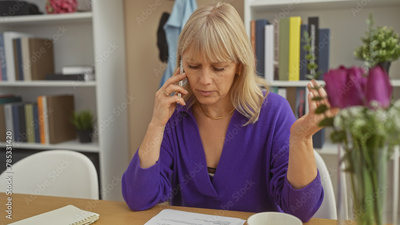 A concerned caucasian woman in a purple sweater talks on the phone at a home office with documents, flowers, and bookshelf background.