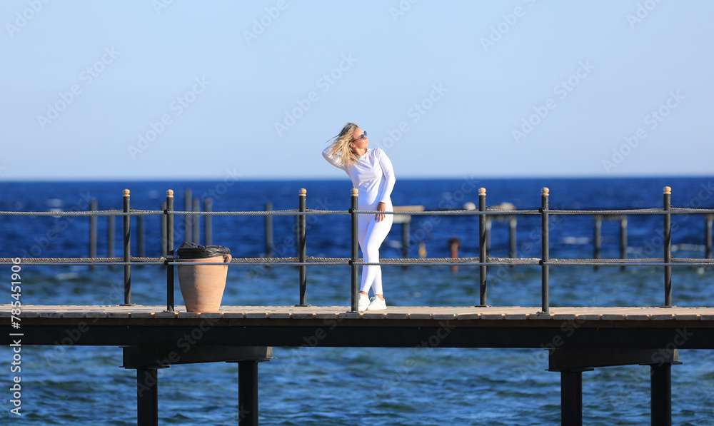 girl in a white tracksuit on the pier