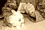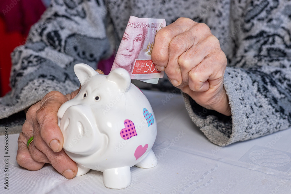 Sweden money, Pensioner puts 500 Swedish kronor into a piggy bank, financial concept, Saving and financial security of elderly people