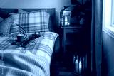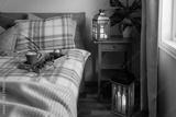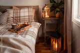 cozy scandinavian bedroom interior in natural tones, blanket candles houseplants