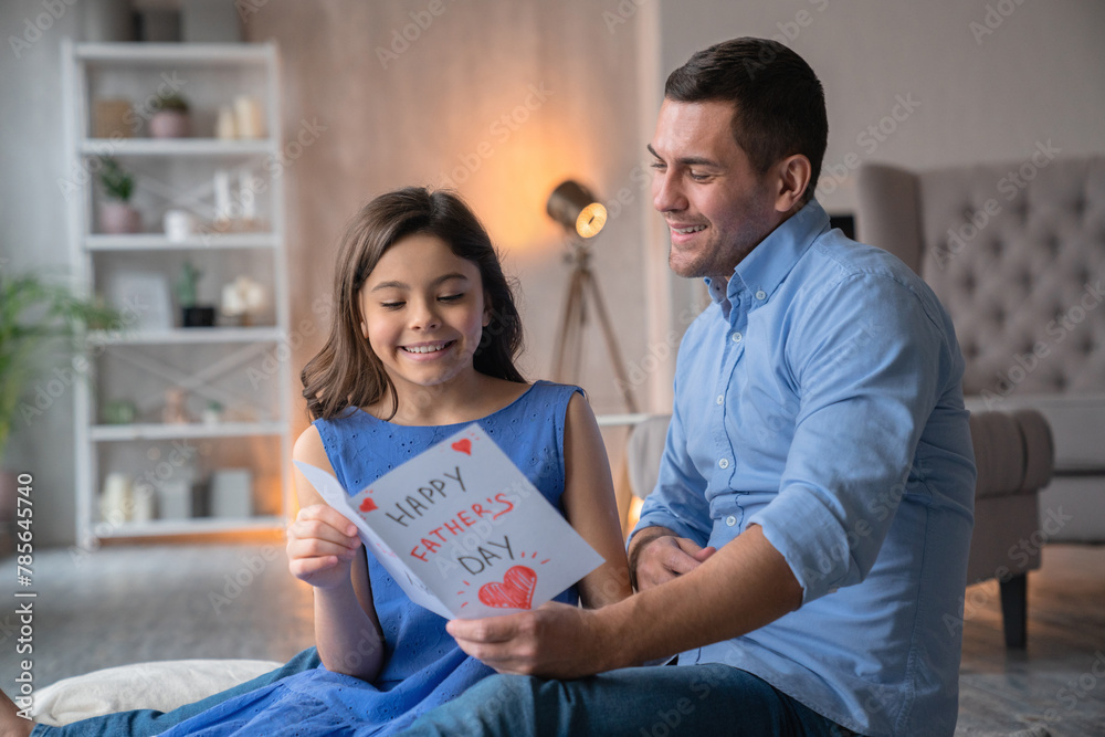 Happy Father's Day! Cute little preteen girl daughter greeting and gives handmade paper card for her attractive young father dad . Family sitting on the floor, cuddling and reading congratulations
