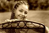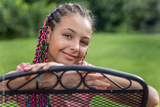 Closeup front view portrait of young girl with colorful braids in her hair sitting on the metal chair outside. Horizontally.