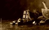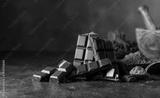 Broken dark chocolate bar and cocoa powder on a brown table.