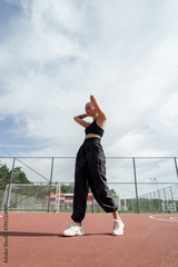 Young female athlete standing on a basketball court, resting after a workout on a sunny day, exuding confidence and strength.
