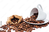 white cup with coffee beans isolated