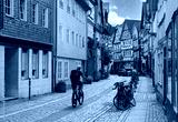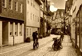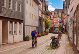 Traditional timber-framed houses line the cobblestone street leading to Marburg Castle, Germany