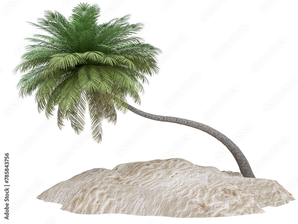 Sandy island and coconut palm tree isolated on background. Piece of round beach with sand for vacation, travel, summer, leisure and enjoy. Summer beach vacation scene concept. 3d rendering