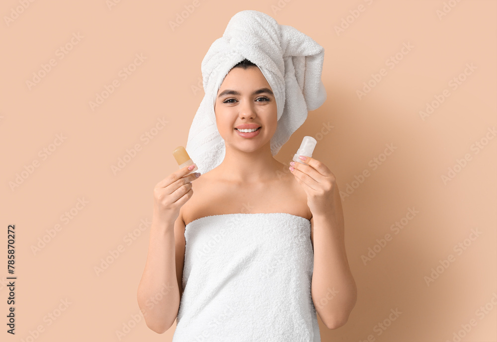 Happy smiling young woman in towel with crystal deodorants on beige background