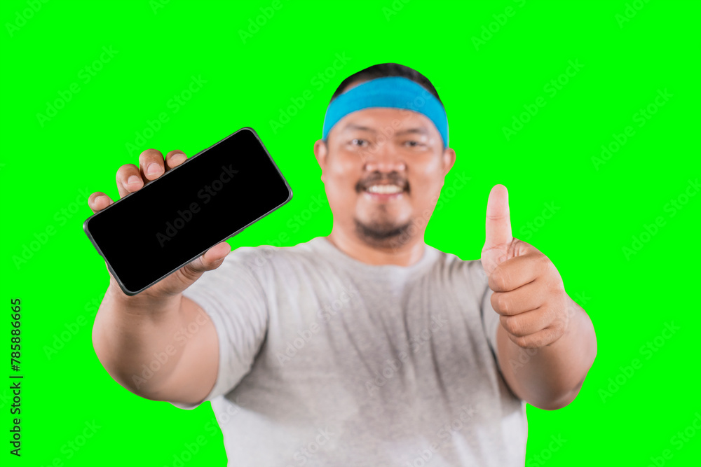 An Asian overweight man shows a finger on an isolated screen