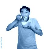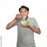 A portrait of a happy Asian man wearing a grey shirt while eating noodles. Isolated with a white background.