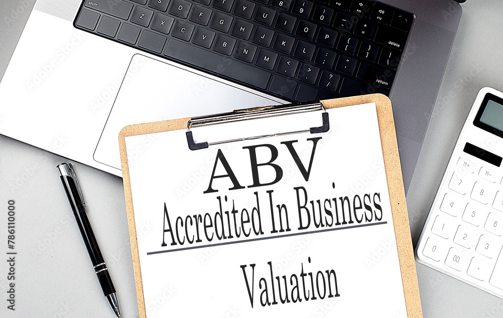 ABV -ACCREDITED IN BUSINESS VALUATION word on clipboard on laptop with calculator and pen