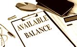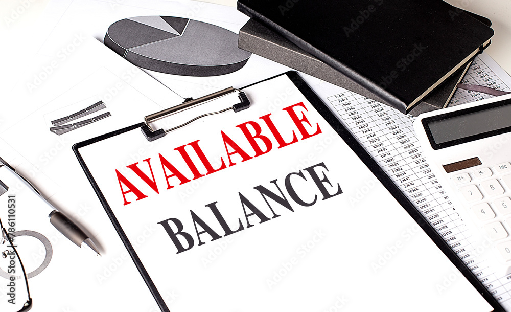 AVAILABLE BALANCE text on clipboard on chart with notebook and calculator