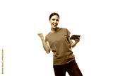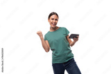 young energetic slender european woman with a ponytail hairstyle dressed in a green t-shirt holds a smartphone