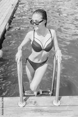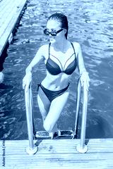 Beautiful happy young woman in red swimsuit comes out of the pool. Vertical photography.