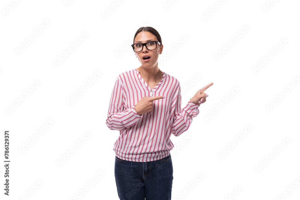 young joyful office worker woman dressed in a pink-white shirt points to an empty space