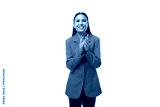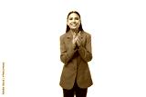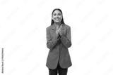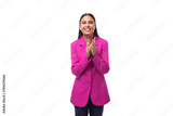 young positive energetic slim brunette secretary woman wearing a purple jacket on a white background