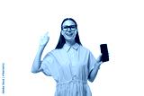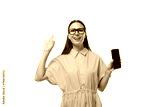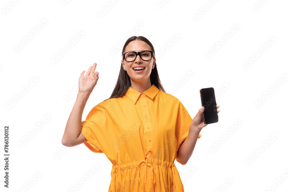 Caucasian young woman with black straight hair wears glasses and a yellow dress