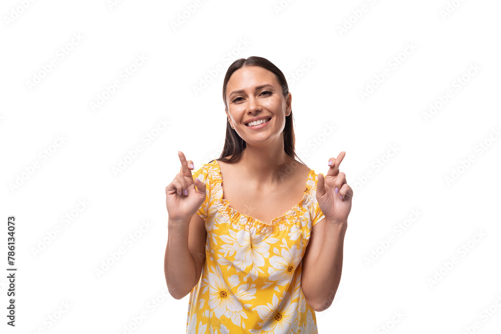 european confident brunette lady with loose hair wearing a yellow t-shirt on a white background with copy space