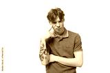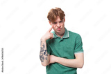 a young man with red hair dressed in a green t-shirt looks thoughtfully ahead
