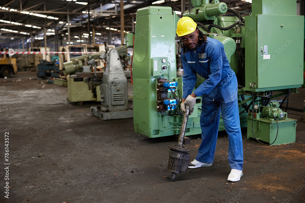 engineer or technician holding heavy equipment spare part for fixing machine in the factory