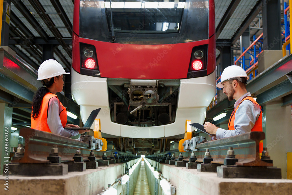 Team of Electrical engineer railway in the maintenance station using tablet pc and touchscreen laptop checking construction process of sky electric train traffic important infrastructure in Thailand