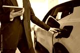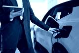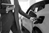 Cropped view of hands of young Caucasian saleswoman, selling electric cars in light modern showroom with panoramic windows. Concept of buying eco-friendly car for progressive customer.