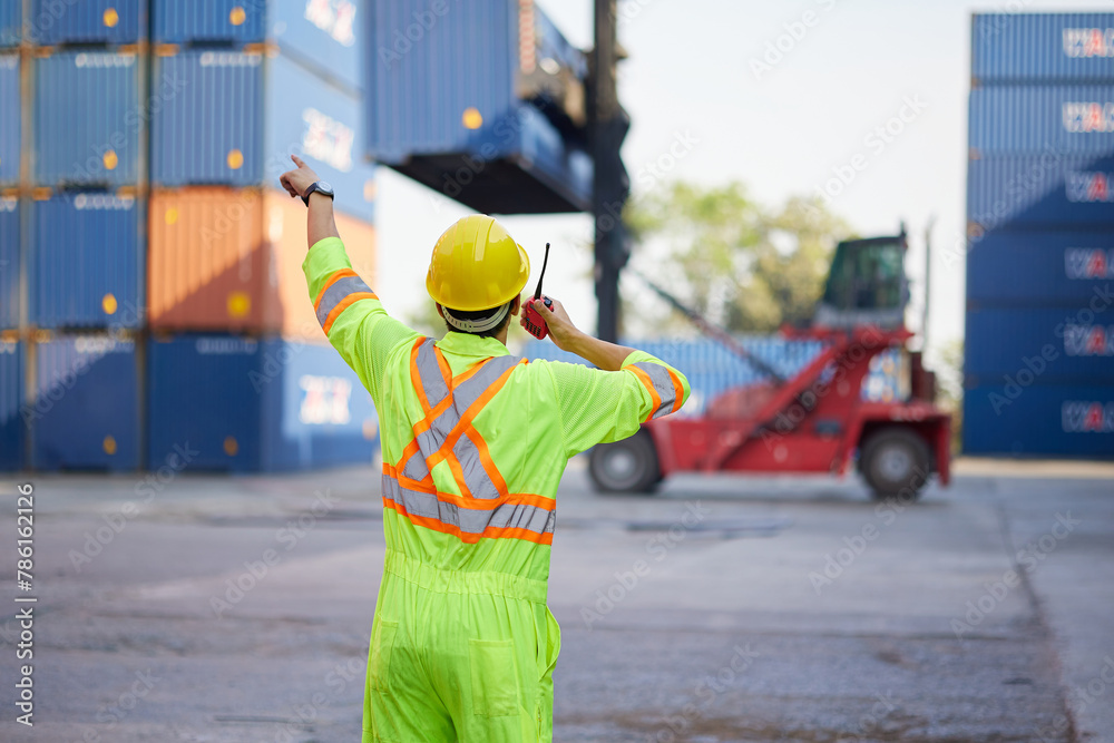 back view worker or engineer using walkie talkie and showing gesture to crane car in containers warehouse storage