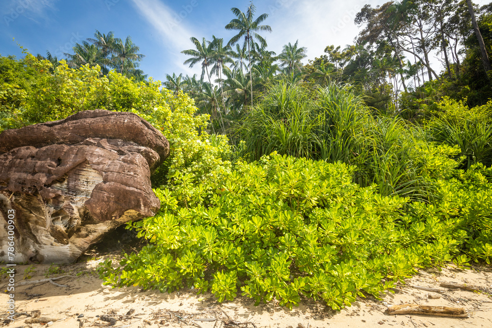 Seaside mangroves and wild coast of Borneo, Landscape, view from the beach to the forest wall