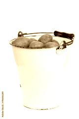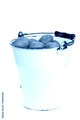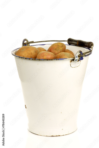 bunch of potatoes in an old enamel bucket on a white background