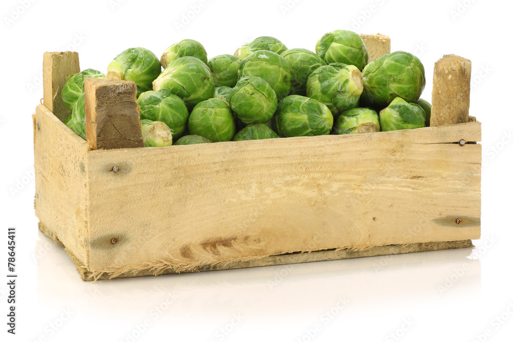 brussel sprouts in a wooden crate on a white background