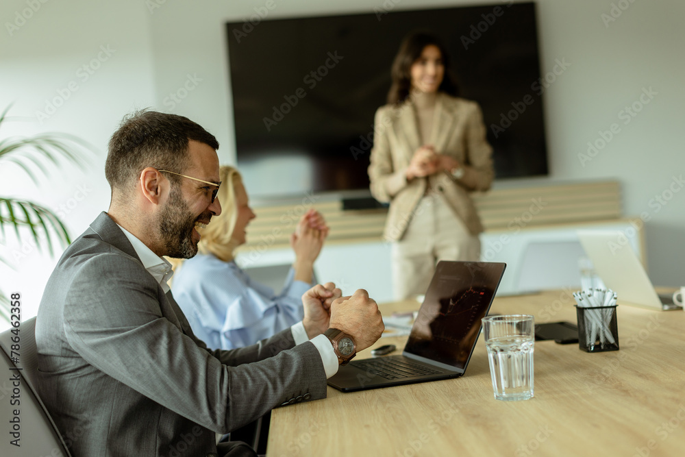 Smiling businessman in a modern office space enjoying a collaborative team meeting during work hours