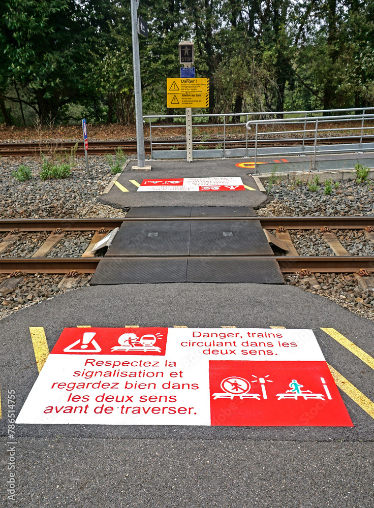 Rail travel and safety are critically important in Europe. Pedestrian railroad track crossing at a rural train station in France. French signs warn to obey signals, look both ways.