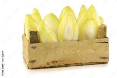 fresh chicory in a wooden crate on a white background