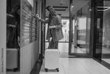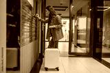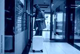 Young woman with a suitcase opening mailbox in hallway of apartment building