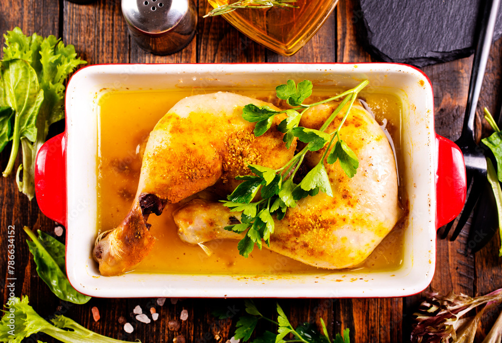 Cooked legs of chicken with spinach on plate. Balanced meal.