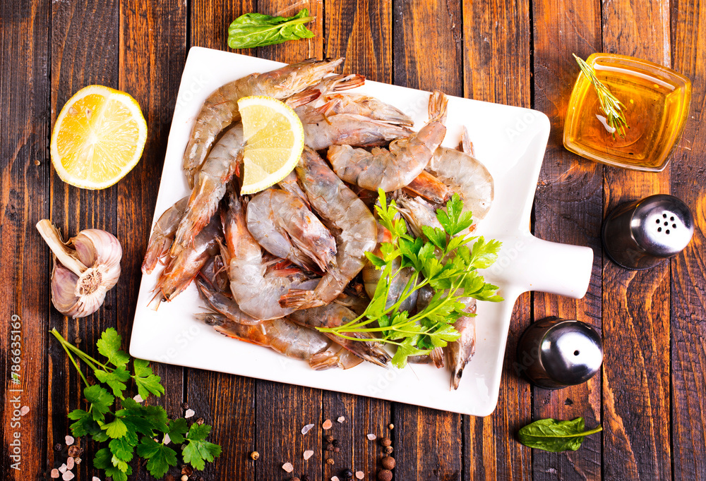 Uncooked Raw peeled tiger white shrimp prawn. wooden background.