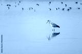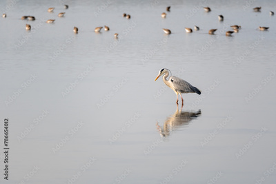 grey heron in a mirror lake. beautiful natural minimalist scenery. lilleau des niges, re island, ornithological reserve