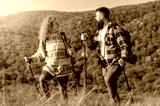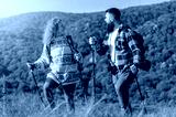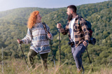 A beautiful and cheerful couple is hiking in the mountains, enjoying nature and each other's company