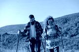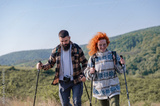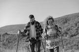 A beautiful and cheerful couple is hiking in the mountains, enjoying nature and each other's company
