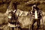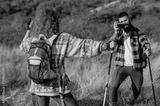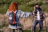 A beautiful and cheerful hiking couple captures a photo with a stunning landscape in the background