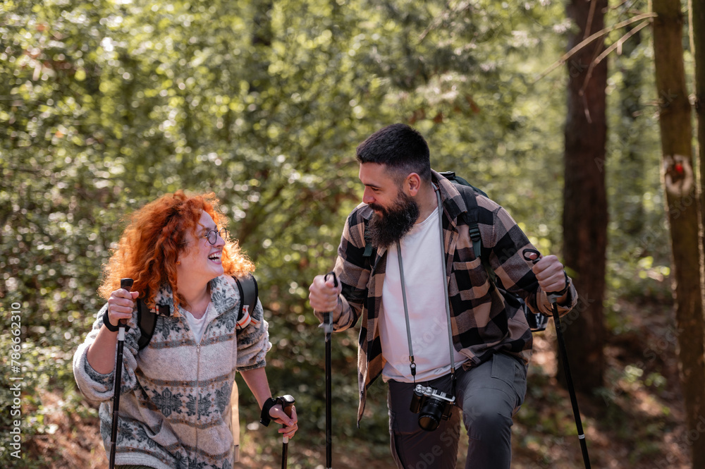 A beautiful and cheerful couple is hiking in the forest enjoying nature and each other's company