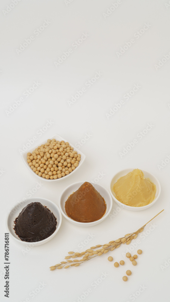 赤味噌や白味噌など様々な種類の味噌・日本の味噌イメージ|原材料の大豆と米(稲穂)