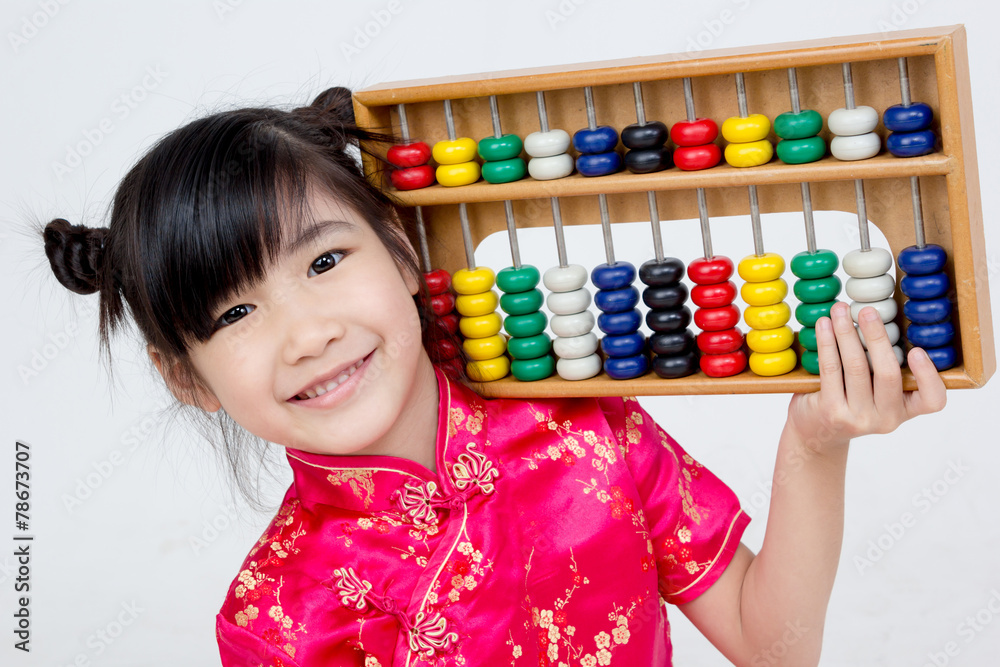Cute Asian girl wearing red traditional Chinese suit with abacus