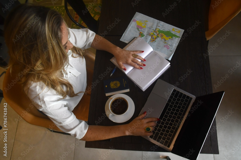 Jovem executiva tomando café sentada num restaurante com xicara de café na mão, pensativa, olhando mapa programando sua viagem