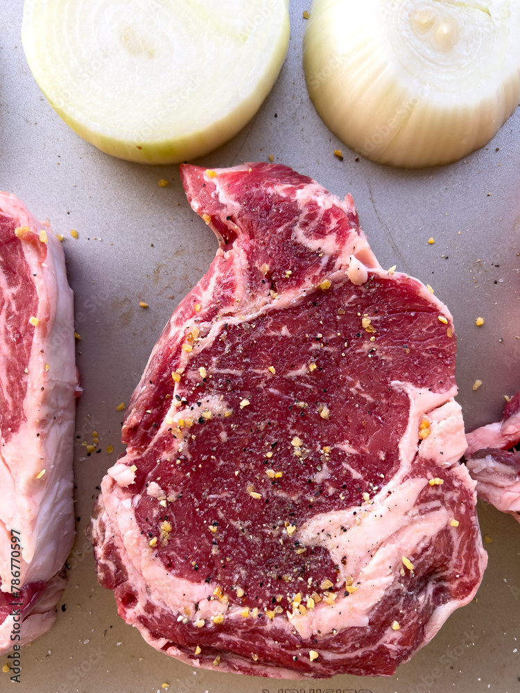Raw Ribeye Steaks Seasoned with Spices and Onion Halves on Tray
