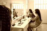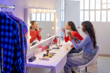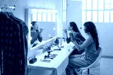 Pretty young female friends putting on some makeup before going out at night. High quality photo